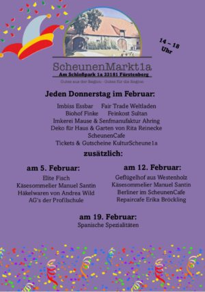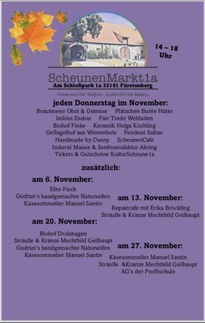 Regional einzukaufen, heimische Produzenten und Händler zu unterstützen, die Herkunft der Ware genau zu kennen, aber auch möglichst verpackungsarm einzukaufen und das ohne lange Anfahrten ist mittlerweile vielen Menschen ein Bedürfnis. Diese Idee hat das Team der KulturScheune1a in Fürstenberg aufgenommen und den ScheunenMarkt1a ins Leben gerufen. Vor Ort saisonal und regional einzukaufen bedeutet für die Bewohner unserer Region aktiven Klimaschutz durch kurze Transportwege. Es begünstigt die Frische und vermindert den CO² Ausstoß. Ein Wochenmarkt verbindet nicht nur Genuss mit bewusstem Konsum, sondern dient auch als Begegnungsstätte für alle Altersklassen und Kulturen im Ort und damit entspricht es genau den Leitgedanken unserer KulturScheune1a: